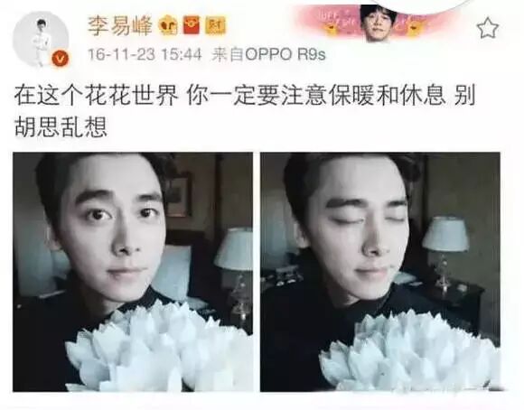 吳昕曾在微博發過最後一天的胡思亂想,李易峰不就就更新了:在這個花花世界,你一定要注意保暖和休息 別胡思亂想。