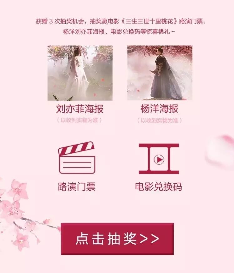 這次全棉時代柔情助映電影《三生三世十裏桃花》,上全棉時代天貓旗艦店,隻需0.01元即可獲得抽獎機會得全棉時代定製版三生三世十裏桃花絕美周邊!還有楊洋劉亦菲見麵會門票,有機會親臨現場,見證白夜CP的三生三世柔情! 趕快行動吧!