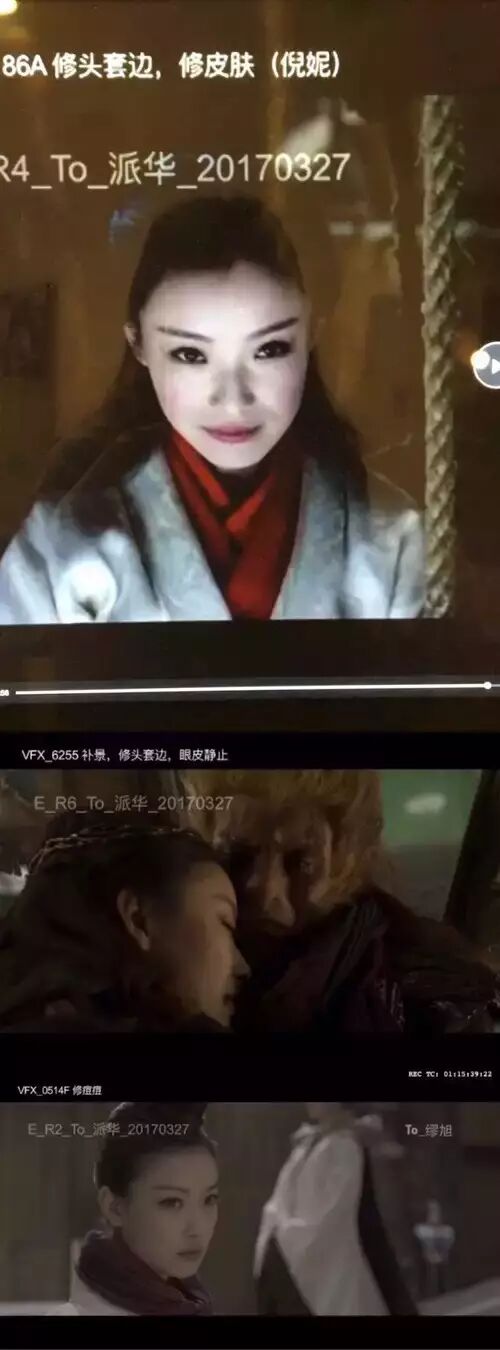 很多明星的造型都是一幀幀的修出來的,例如倪妮的《悟空轉》後期一幀一幀的幫她PS。屏幕上大寫著要求:"修頭套""修皮膚"(倪妮);"補景""眼皮靜止""修痘痘"等。周迅的《如懿傳》為了讓周迅的造型更加貼合劇情也是修過的。