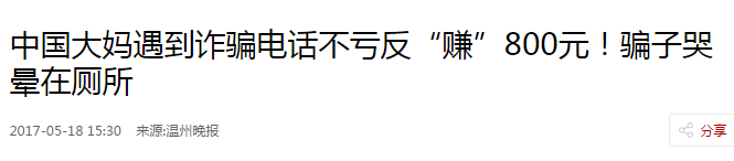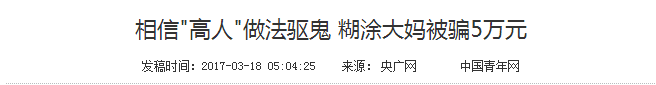有時大媽是最容易被騙的。3月16日上午,家住湖北省黃石市勝陽港街道的吳大媽趕到黃石市公安局黃石港分局勝陽港派出所報警稱,自己被路遇的"高人"騙了。大媽聽高人說兒子被鬼纏身,於是拿出5萬元積蓄,交給"高人"為兒子驅災,不料被騙的欲哭無淚。