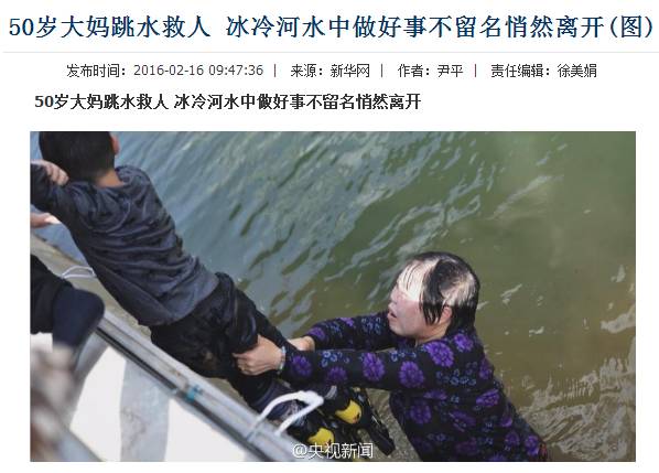 2016年的大年初四,貴州都勻市一8歲男孩滑旱冰衝入河中。危急時刻,一位大媽跳下了水,在岸上人們幫助下,男孩被成功救起。救人大媽表示先照顧孩子後,就遊到河對岸悄悄走了。大媽叫王友群,50歲,她說不求回報不接受采訪,隻說這是小事。