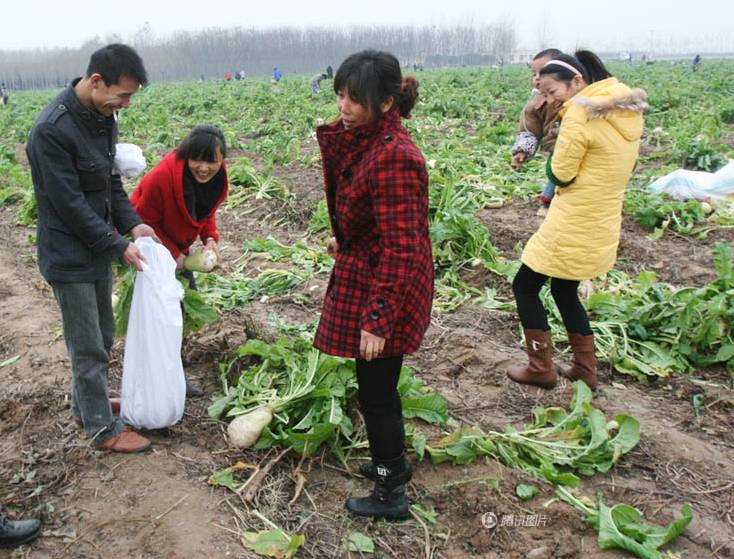 2011年11月25日,河南鄭州,農民韓崗的80多畝蘿卜滯銷,他決定免費贈送給市民食用。媒體刊登消息後,引來三萬人拔蘿卜。蘿卜拔光了,種的紅薯也被偷挖走2萬斤。幾天來,韓崗家損失了數萬元。