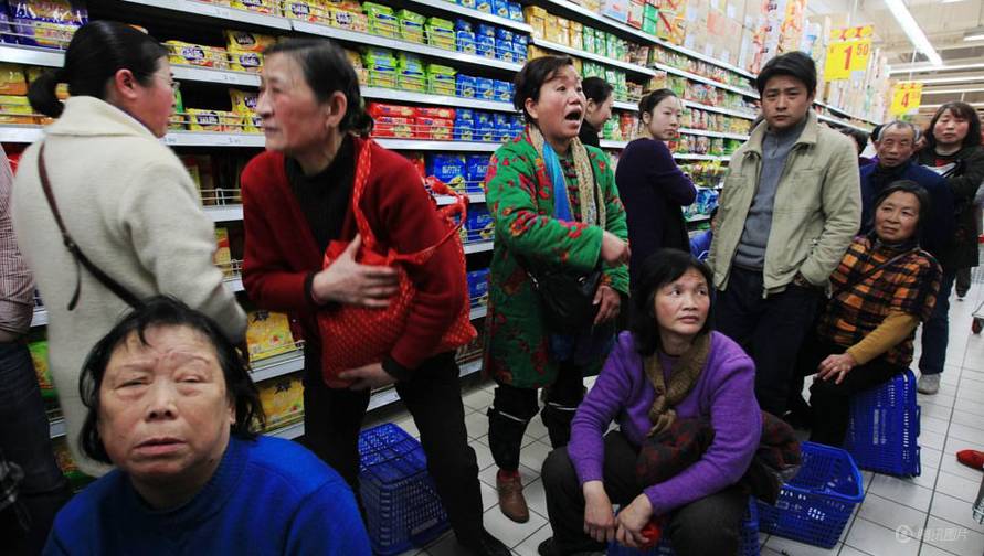 2011年3月,日本發生的9級大地震導致了中國國內的搶鹽風潮——傳言稱食鹽可用來防輻射;另一傳言稱日本核輻射汙染將汙染海水,導致食鹽不能食用。2011年3月17日,武漢一家超市,排隊等候食鹽上架的市民。圖片:CFP