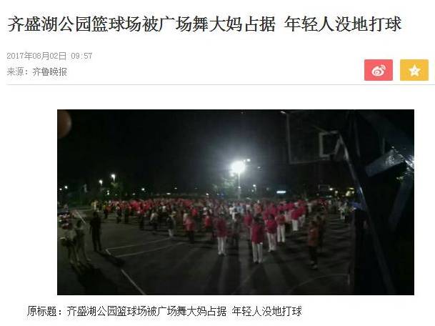 大媽們有一種不可描述的霸氣。搶籃球場的事情已是屢見不鮮。8月2日最新消息,位於張店區的齊盛湖公園籃球場被跳廣場舞的大軍占據,導致諸多籃球愛好者沒有地方打籃球。曾有籃球愛好者前去和跳廣場舞的人員協商,但是大媽們並沒有讓出籃球場,有的阿姨說,他們已經考慮到有人打籃球,所以會晚點去跳廣場舞。也有的阿姨表現並不友好。