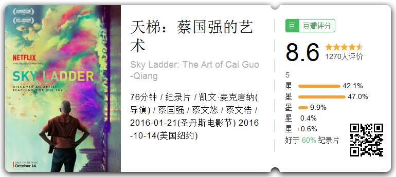 奧斯卡金獎導演導演凱文·麥克唐納花了2年時間,拍了一部關於蔡國強的紀錄片,叫《天梯:蔡國強的藝術》,講的是他80年代從泉州出發,到走向國際舞台成為享譽全球的爆破藝術家這30年間的經曆,特別令人感動。