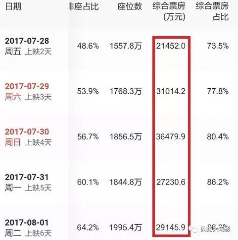 趁著周末可以衝一波小高峰,根據經驗,周末票房會比工作日要高,而票房收割機之所以能夠成為收割機,是因為它可以打破周末和工作日的限製。比如《戰狼2》: