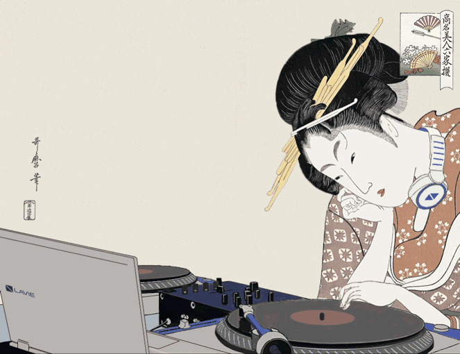 ▲ 鈴木春信的《笠森於仙》本來描繪的是江戶時期一家茶屋中的美貌的斟茶女子於仙,在瀨川三十七的改造下,茶杯被玻璃杯取代,茶換成了可口可樂,武士戴上耳機,麵前多了一台筆記本電腦。