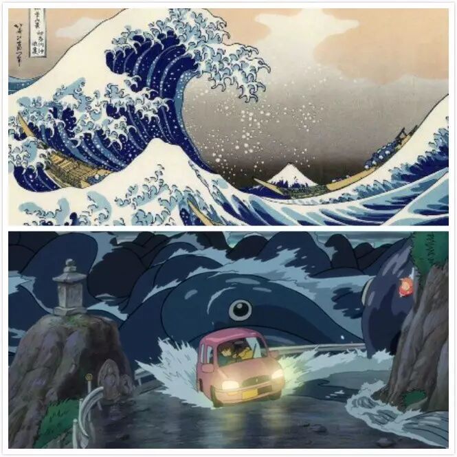 ▲ 宮崎駿導演的《懸崖上的潑妞》的驚險一幕,重現葛飾北齋《神奈川衝浪裏》的瞬息變化,人與自然抗爭的主題
