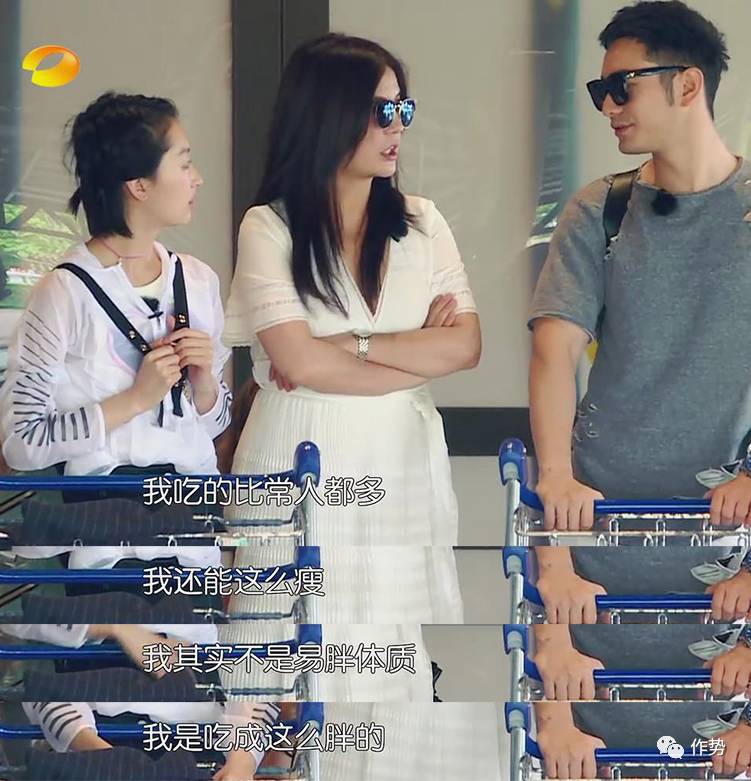說她在這裏扮演黃曉明永遠的白月光,也不至於。這兩個人的互懟模式一開始就開啟,趙薇對著鏡頭坦然地調侃自己的身材,說"我胖是因為我吃得多"。