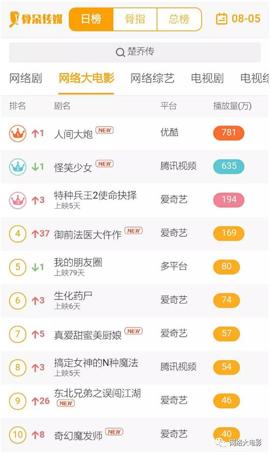 上線40小時播放量破千萬,由MC天佑以及本山弟子張小飛主演的網絡電影《人間大炮》8月4日登陸優酷,在上線的首周末快速攀升行業排行榜第一。東北喜劇再次在提振市場,風頭無減。