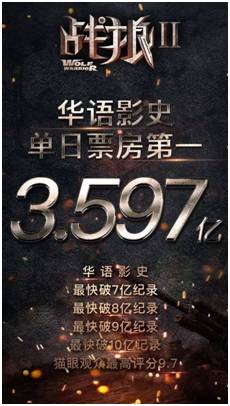 4小時破億,25小時3億,3天6億,4天9億,5天12億,《戰狼2》猛然成為今年國產片中的現象級爆款,一夜刷屏!