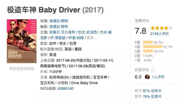 豆瓣評分7.8,好於87%的動作片,78%的犯罪片。