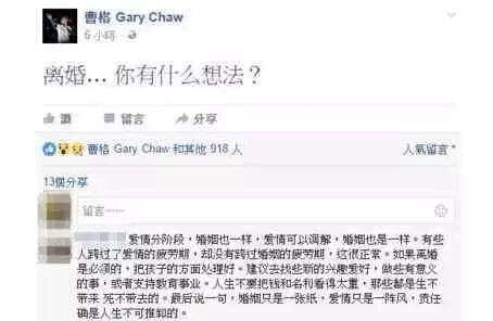 近日曹格突然在社交媒體發布了這樣一段話:離婚……你有什麼想法?立馬引起了網友熱議。這難道是發生婚變了?許多網友現身安慰曹格。