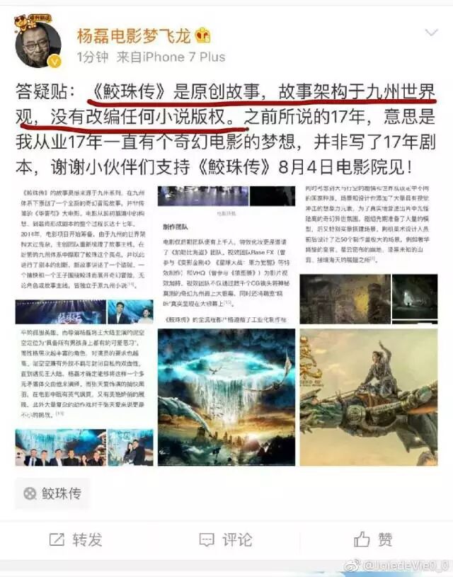 在關注電影《鮫珠傳》時,網上有一些關於影片IP的爭論話題,不過導演楊磊的回應很清楚——