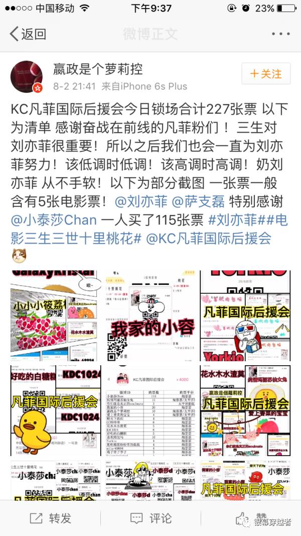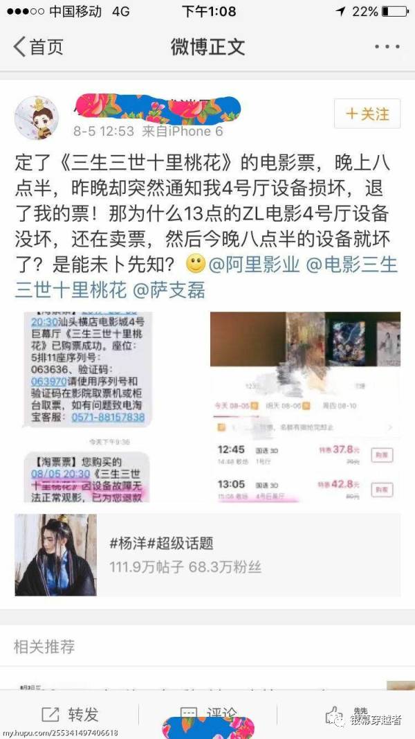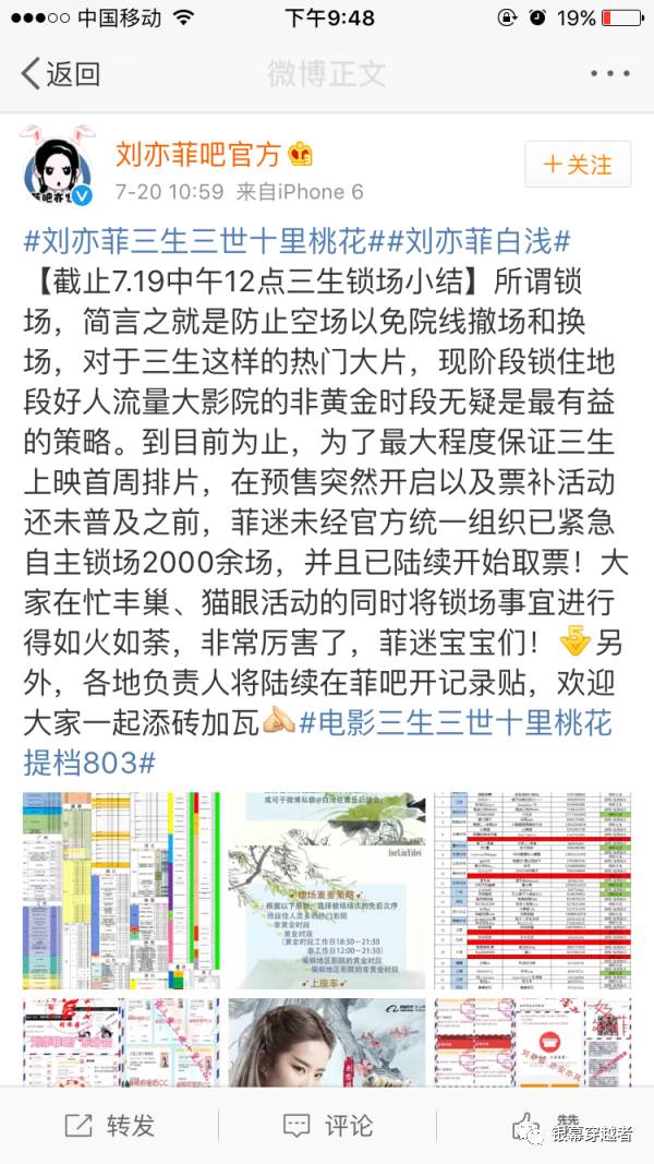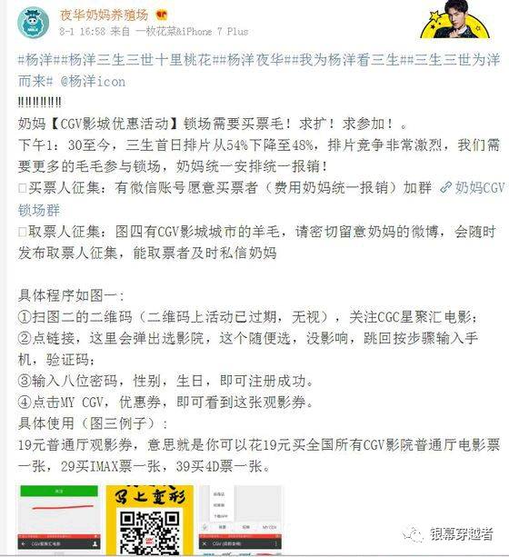 在《三生三世十裏桃花》首映當天,"楊洋天涯粉絲樓"在微博曬電影票,自曝已經為影片鎖場1000多場,號召更多的"羊毛"(楊洋粉絲的昵稱)活動起來。
