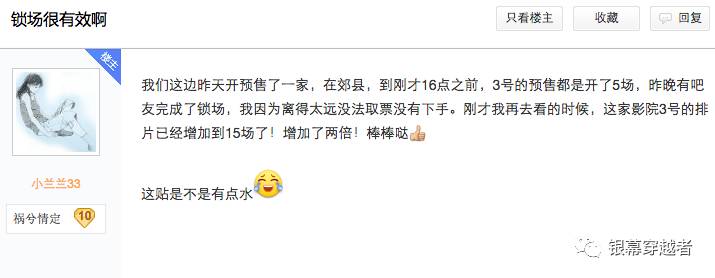正常情況下出現空場,影院會撤場或換場,粉絲在影片放映之前買上1-2張票,院方就沒辦法撤場或換場。和包場相比,鎖場無疑是提高排片率最經濟的方式。