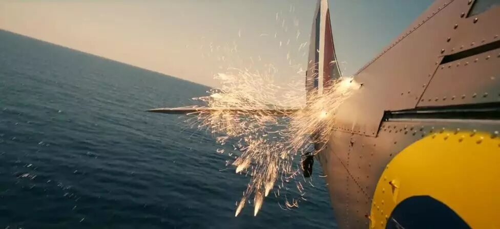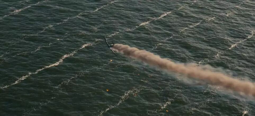 "這是實景拍的!我們造了個噴火戰鬥機的複製品,真的讓它迫降到了水上。為了拍這一幕,我們把IMAX攝像機綁到了飛機身上,但沒想到在墜機的過程中,這套設備下沉的速度比我們預期的要快,畢竟從來沒人這麼幹過。把IMAX攝像機從水裏撈出來的時候才發現,外麵的塑料殼破了個洞,整個攝像機全是泡在水裏麵的,完全浸濕了。