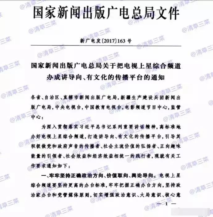 2017年是綜藝市場的"政策大年"。從6月份起,廣電總局針對綜藝節目的各種"最嚴限令"在網上傳得沸沸揚揚。今天上午(8月5日),有娛樂博主網上曬出國家新聞出版廣電總局於近日下發的《關於把電視上星綜合頻道辦成講導向、有文化的傳播平台的通知》文件(以下簡稱《通知》),這一新政對上星綜合頻道提出了七大要求,包括做好節目價值導向,以央視內容為標杆;鼓勵電視上星綜合頻道在黃金時段增加公益、文化、科技、經濟類節目的播出;繼續加強綜藝娛樂、真人秀等節目管理調控等等。至此,網傳的廣電總局"最嚴限令"實錘落地。