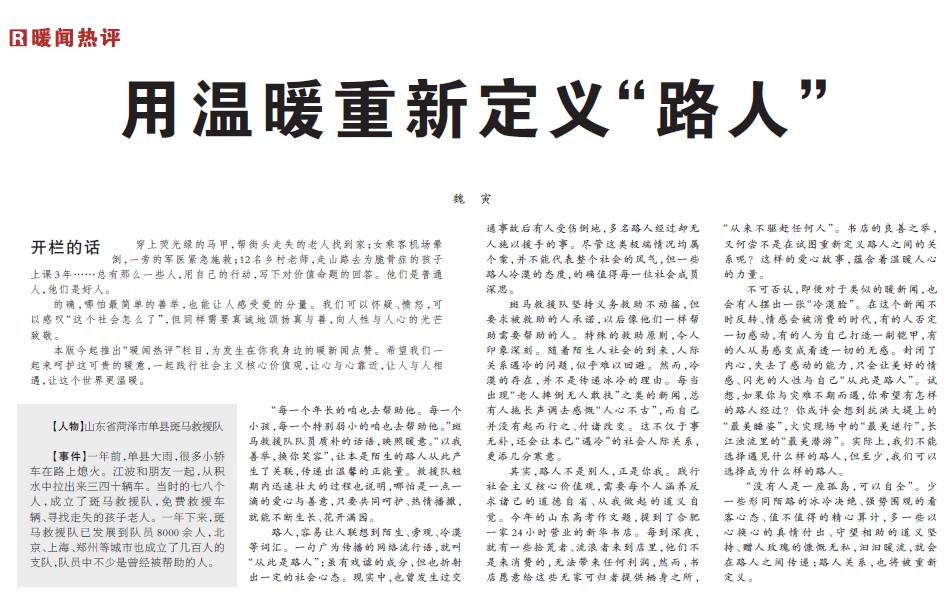 平凡而精彩的人生還少嗎?就像最近一段時間,無數以前看似不起眼的人和事湧入我們的視線,一個叫作"暖聞熱評"的新欄目在咀嚼並傳播著正能量。或許,我們致敬的主人公沒有驚天地的舉動,沒有泣鬼神的故事,沒有流芳千世的功利心,卻實實在在地活出了自己的美麗。至今想來,那段時間全國各地暴雨不斷,抗洪救災成了多數人的關切,有武警戰士、有長沙市民、有為孕婦讓車的防總官員,他們沒把自己當成洪災的看客,而在竭盡全力為疏通一個城市、救助一名群眾忙碌著。這幾天,當人們慶祝建軍90周年時,老兵的勤儉、軍嫂的奉獻,給一支人民軍隊增添了溫情、催生了力量。同樣,我們感動於修繕長城的工人們,他們年複一年、日複一日地守護著"文化長城";也被學跳舞的六旬大爺深深觸動,"有夢的日子,每天都閃光"。在他們身上,看不到"主角光環",看到的是普通,而其中飽含的堅持、堅強與堅毅,成全了自己也成全了他人。