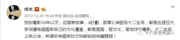 我拍電影30年以來,從警察故事,a計劃,醉拳2,神話到十二生肖,都是在號召大家保護每個國家自己的文化遺產,都是愛國,愛文化,愛地球的電影。十二生肖上映之後,希望所有國家的文物都能夠完璧歸趙!