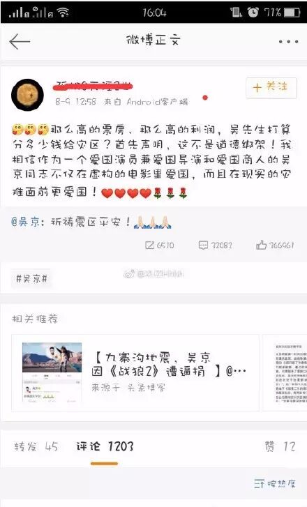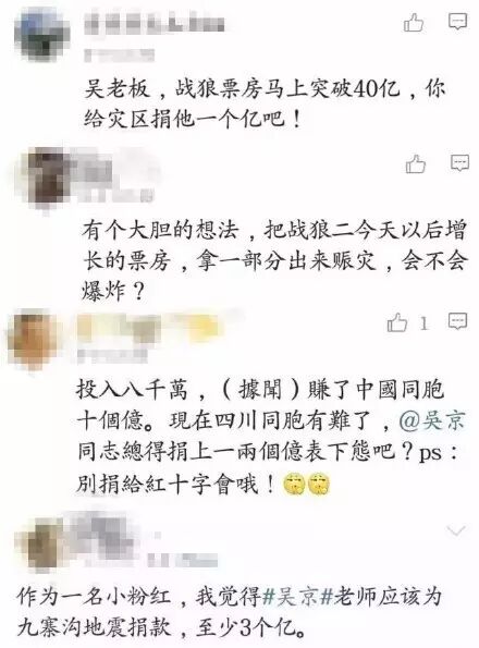 不少人覺得《戰狼2》大賣都得歸功於國人的愛國主義和民族情緒高漲,甚至有言論說《戰狼2》是在替國家收愛國稅。現在四川地震,吳京你這個賺得盆缽滿盈的愛國商人也該交點愛國稅表示一下了吧。