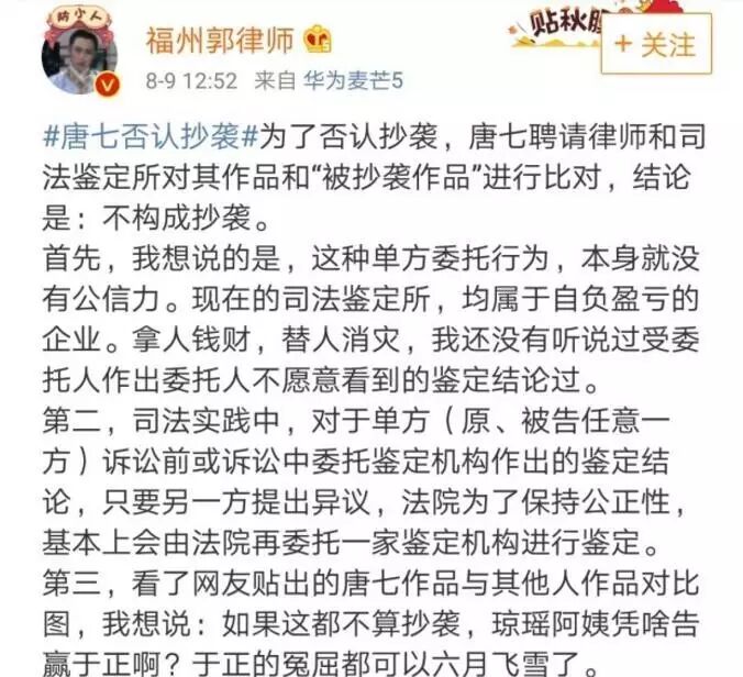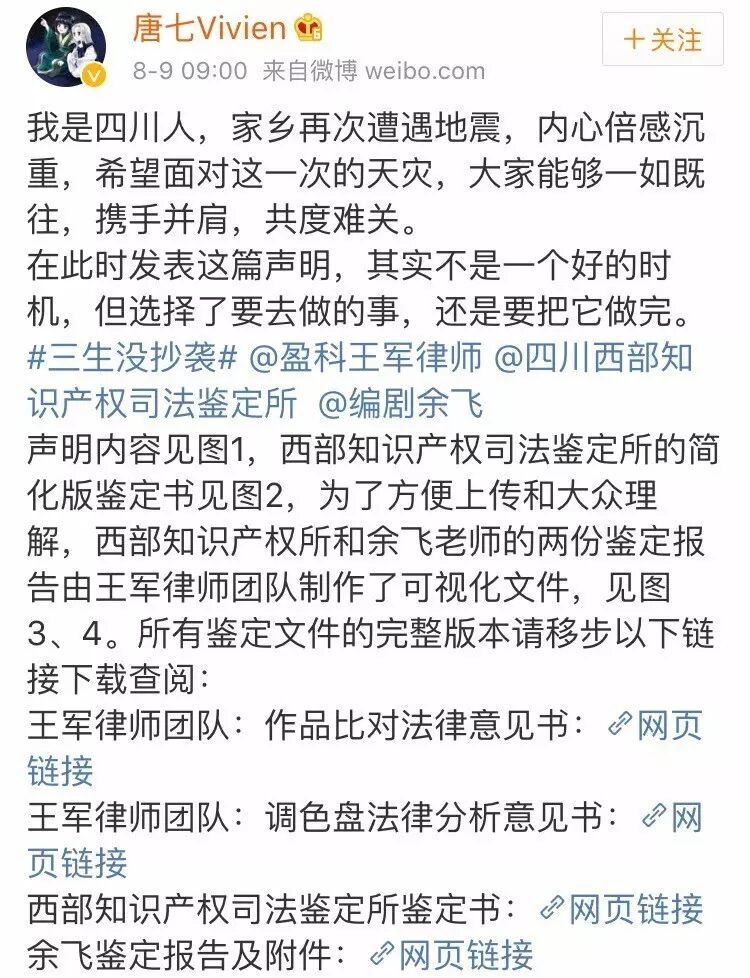 結果,就在昨天,唐七親自發博回應自己沒有抄襲,還選了這麼一個特殊的時間點。#怎麼看都是在蹭熱度,還是很low的那種#