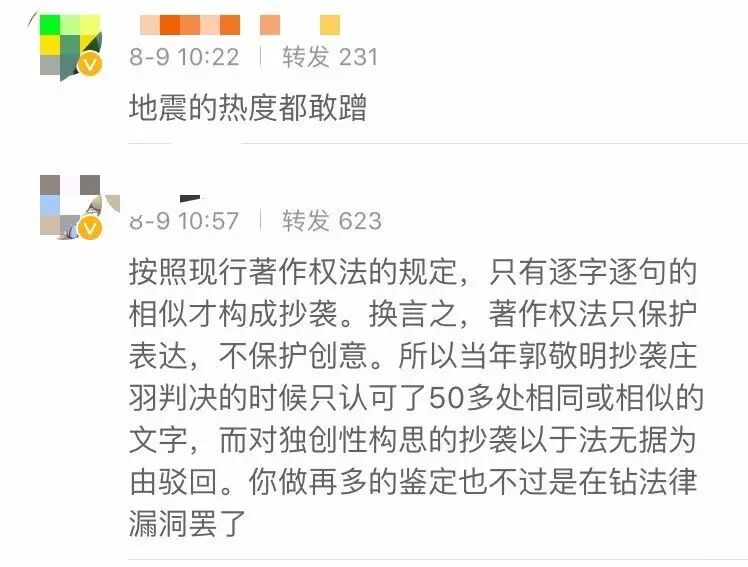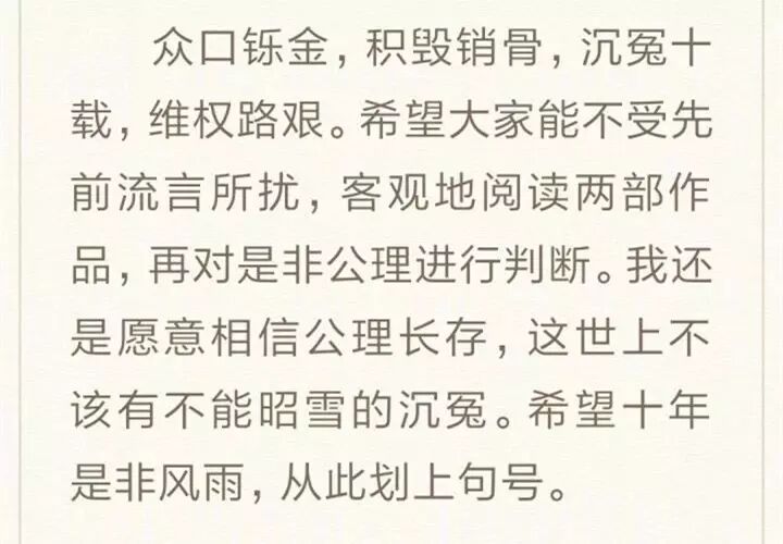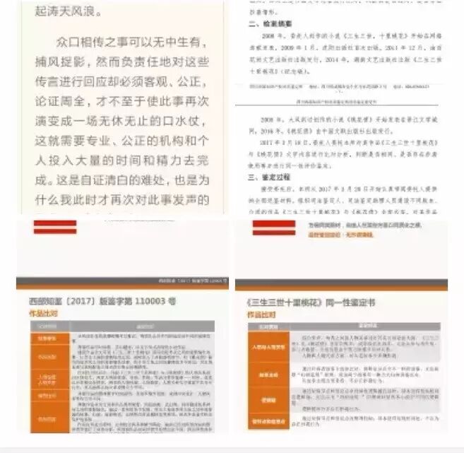 在博文下麵,她附上了聲明和證據,稱找了王軍律師團隊、西部知識產權司法鑒定所和編劇餘飛為她做鑒定,3方機構的鑒定結果都說明,她沒有抄襲。