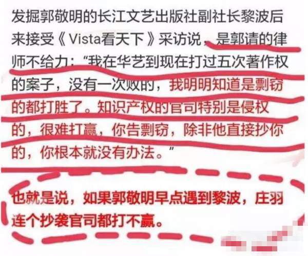 不禁想起當年莊羽狀告郭敬明抄襲,當時發掘郭敬明的長江文藝出版社副社長說過的這段話: