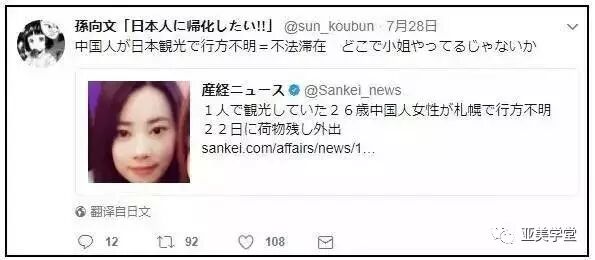 "中國人來日本失蹤,其實就是黑下來了。估計在哪兒當小姐賣身了吧?"