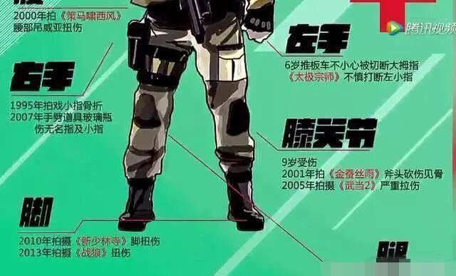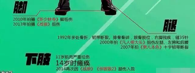 看看吳京這受傷圖吧,著實讓人心疼,羅列出了吳京在拍攝影視時候所受的傷,據說吳京拍戲受傷多達60餘次,曾下身癱瘓大小拇指都被切斷!
