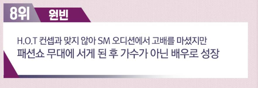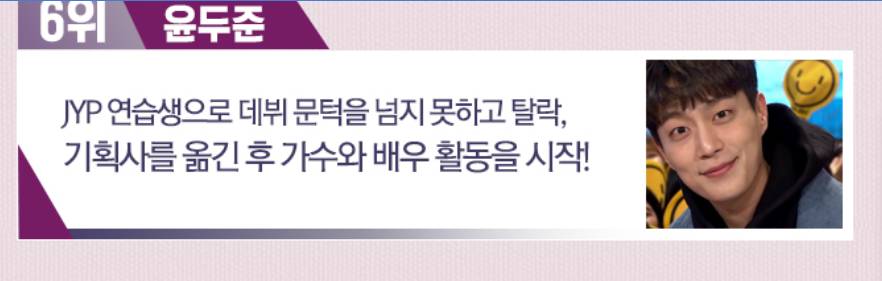 6.尹鬥俊在JYP的公開招聘第一期選拔大會上奪得了第三名,但後來也沒有出道,直到去了方塊。如今作為高光的一員,也是成功的典範。