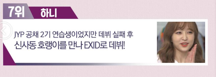 7.EXID的成員Hani也曾經是JYP的練習生,甚至被選入出道組,但後來計劃失敗,Hani也離開了公司,組成了如今的EXID。