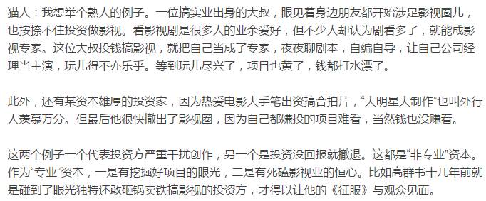 在北京娛樂信報的影視資本專訪中,圈內人就這樣揭示了外行人投資的薄弱。