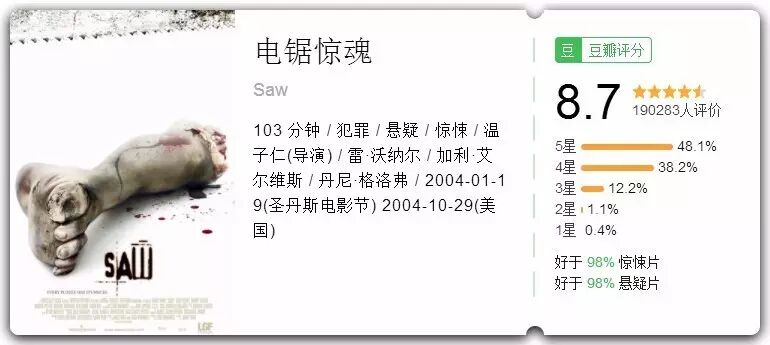 評分係列最高8.7,名列豆瓣TOP250第117名,是豆瓣上評分第二高的恐怖片。(第一是《靈異第六感》)