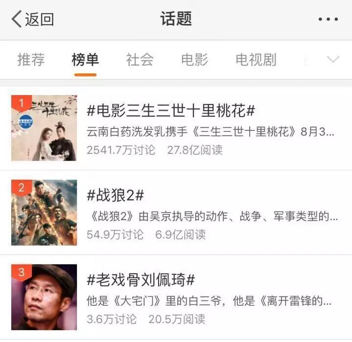 在網友們的熱情助力下,話題#老戲骨劉佩琦#也是一直在保持在新浪話題榜上,在#電影三生三世十裏桃花#和#戰狼2#的圍堵下,還是強勢擠進話題榜TOP3,可見網友對劉佩琦的認可和共鳴。