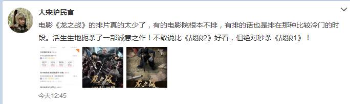 然而這樣一部用心打造的電影,在上映第一天卻陷入了院線排片的瓶頸,網友們紛紛發聲表示,想看電影《龍之戰》卻無地可去!